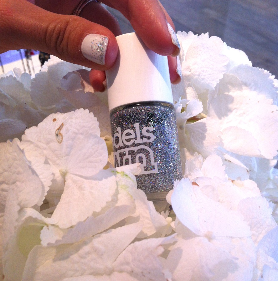 J’ai alors posé une base blanche avec le classique Blanc d’Essie, j’ai ressortie mon Juicy Jules de Models Own. Un flacond rempli de mini paillettes argent aux reflets holo.
