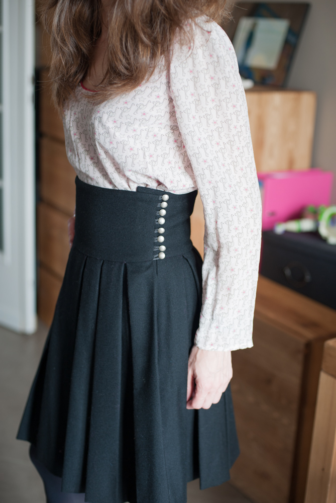 J’aime beaucoup la forme de cette jupe, c’est un modèle récurrent chez Charlotte. Une jupe qui se porte haute pour marquer la taille, ornée de délicats boutons.
