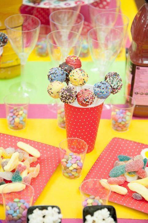 Sur place nous avions, rien que pour nous une magnifique table remplie de gourmandises très colorées: bonbons, cakes pops, cup cakes et des jus de fruits.