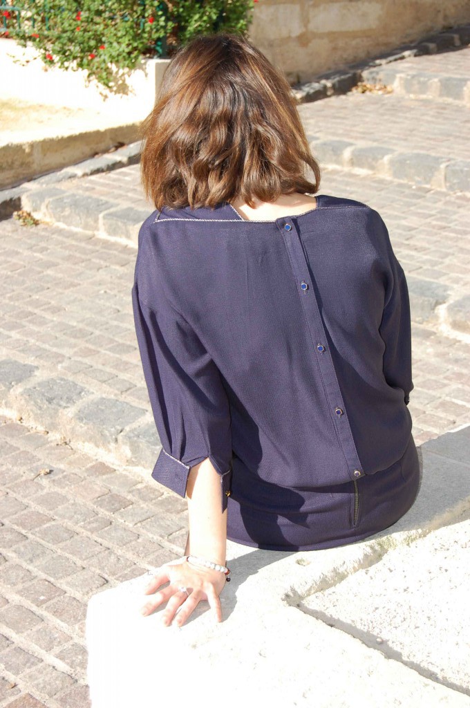 Bel ensemble La Petite Française. En réalité ce n’est pas une robe mais une blouse associée à une jupe patineuse dans le style de celle-ci. On aime le détail argent aux épaules, les boutons dans le dos et le cuir au niveau des poches…