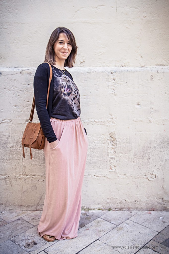 Finalement je trouve qu’elle se porte facilement. Elle est simple, en coton, fluide et très agréable. Ici, associée à une paire de mocassins et un simple tee-shirt, elle fait son effet. Mi bohème, mi chic!