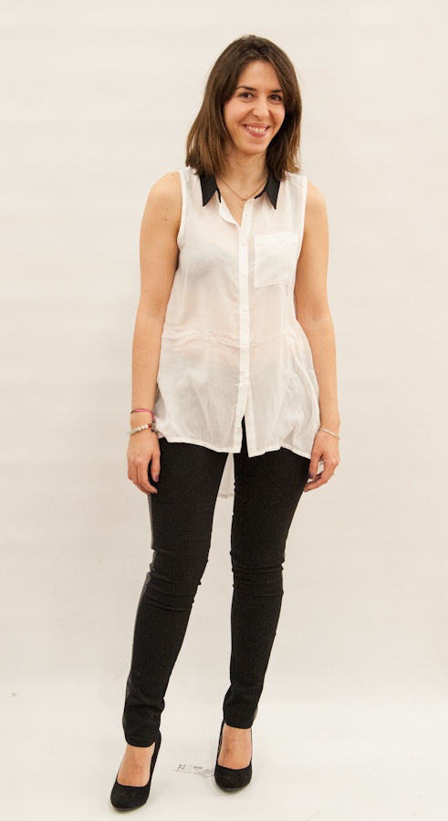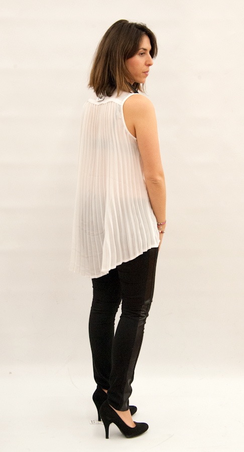 Pour commencer justement une tenue plutôt élégante: un pantalon noir avec un liseré façon cuir sur le côté et un chemisier blanc avec le col noir, aux pieds des escarpins noir.