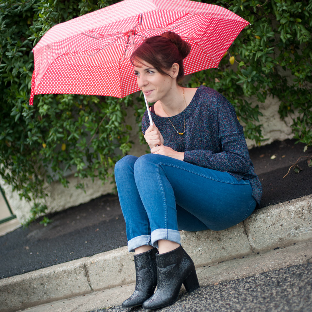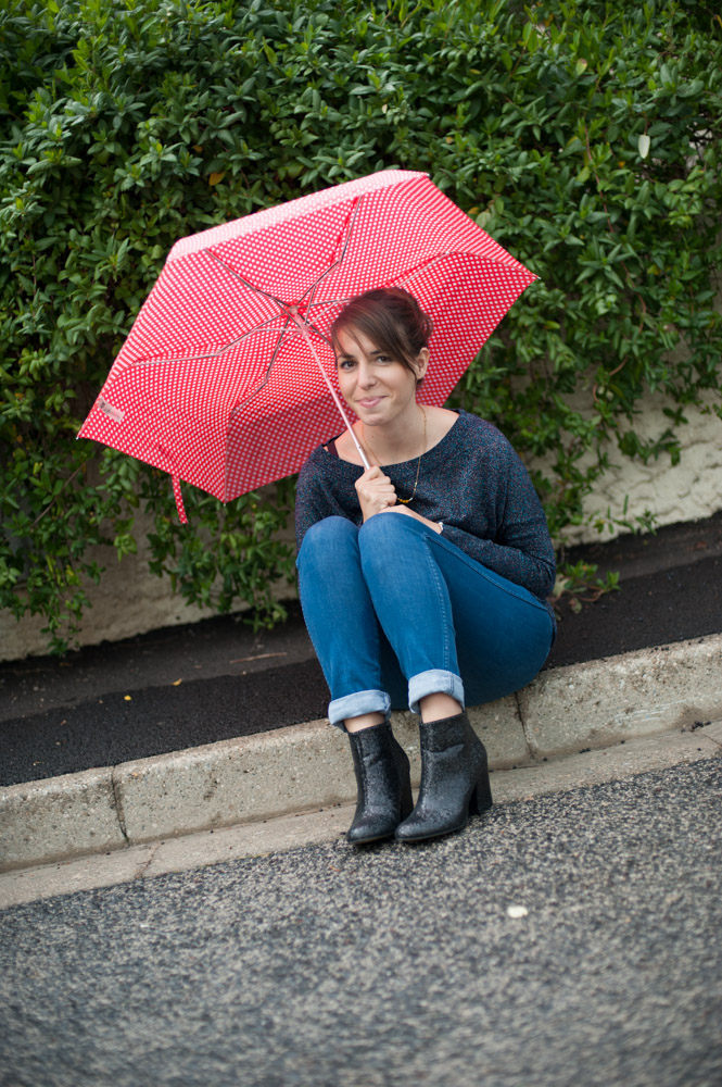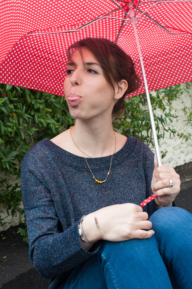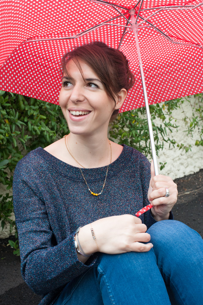 Un jour tu décides de faire des photos. En plein mois de mars. Tu as choisi ce jour parce qu’il est censé être ensoleillé. Puis le soleil s’avère être une éclaircie. Éclaircie qui ne durera pas plus d’une demi-seconde. Finalement il pleut. D’un look paillettes qui pètent tu te retrouves sous un parapluie à pois. Improvisation totale! Heureusement je suis bien entourée: un photographe qui gravit la pluie, une soeur qui me soutient et une nièce que les gouttes ne dérangent pas.
