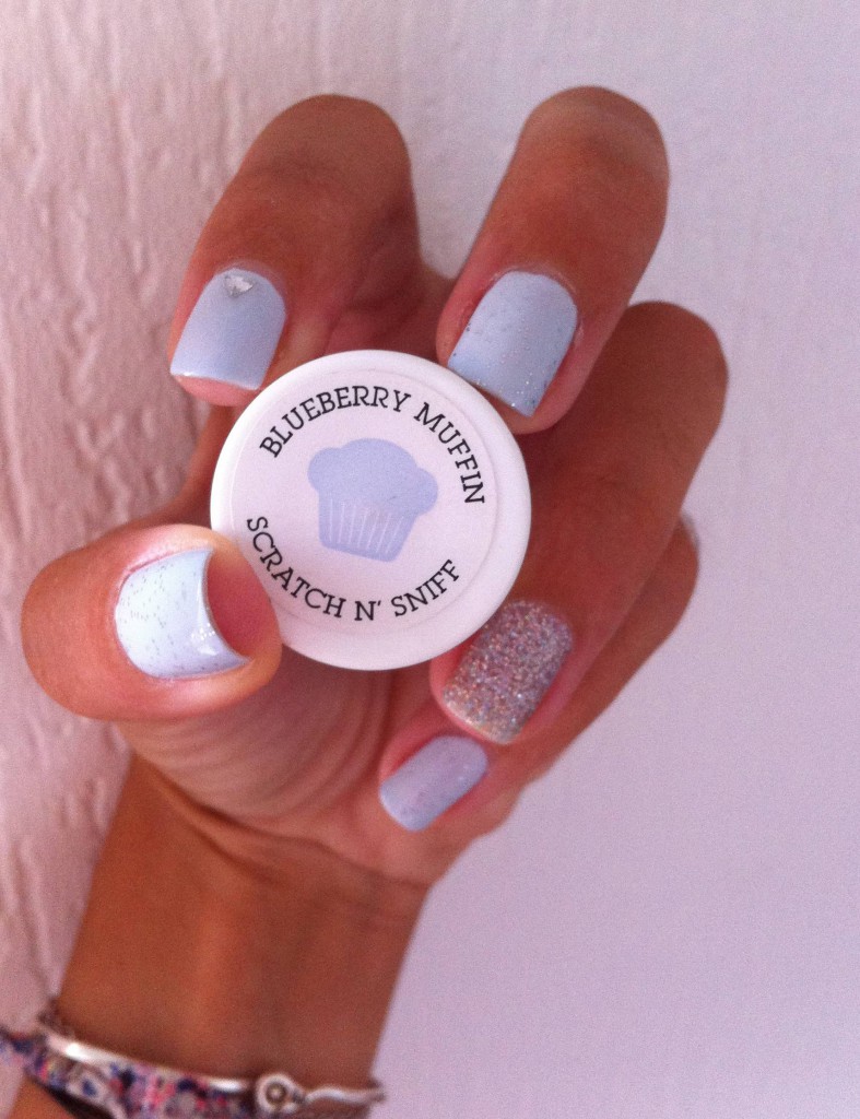 J’ai fait un nail art léger avec les paillettes Juicy Jules en accent nail, les paillettes argent KIKO sur le Blueberry Muffin et un strass sur l’index. Simple et facile! L’odeur, de fait, a été un peu masquée mais elle reste très fruitée et surprenante.