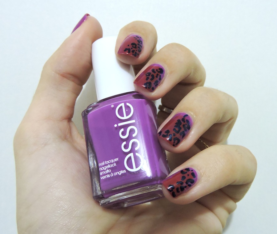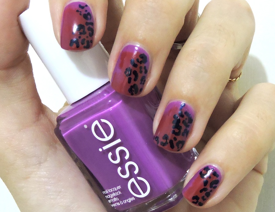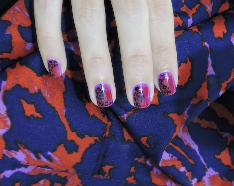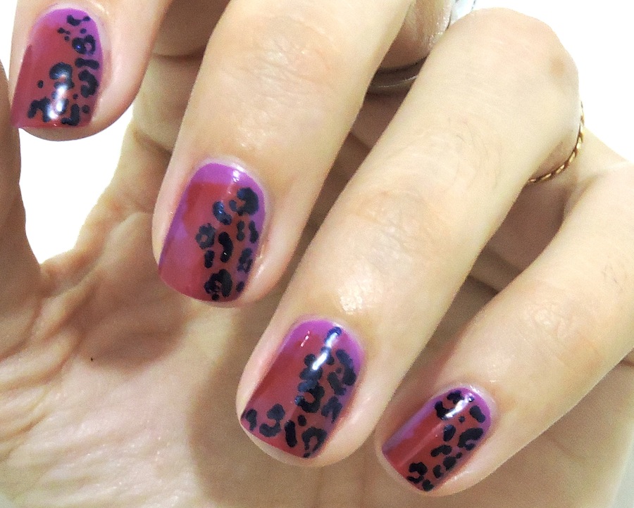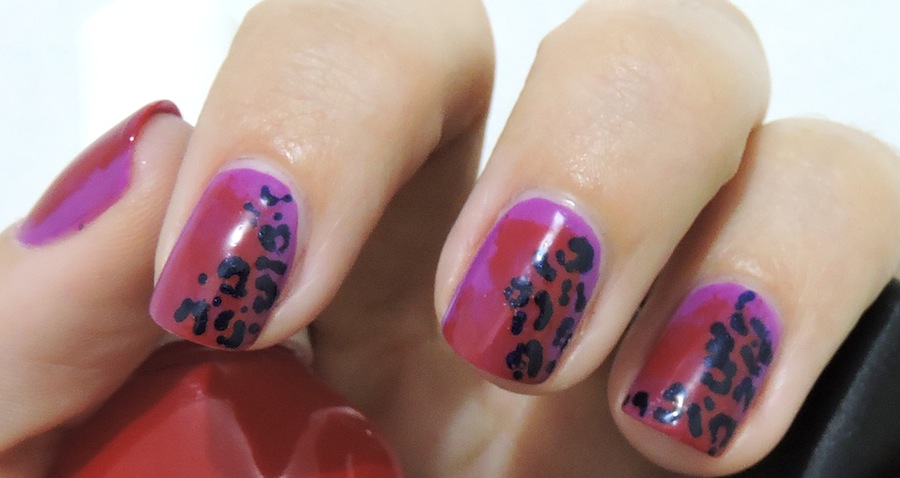 Aujourd’hui il m’a inspiré un nail art. Un imprimé tacheté, tel du léopard, un fond rose et des touches de rouge. Fastoche!