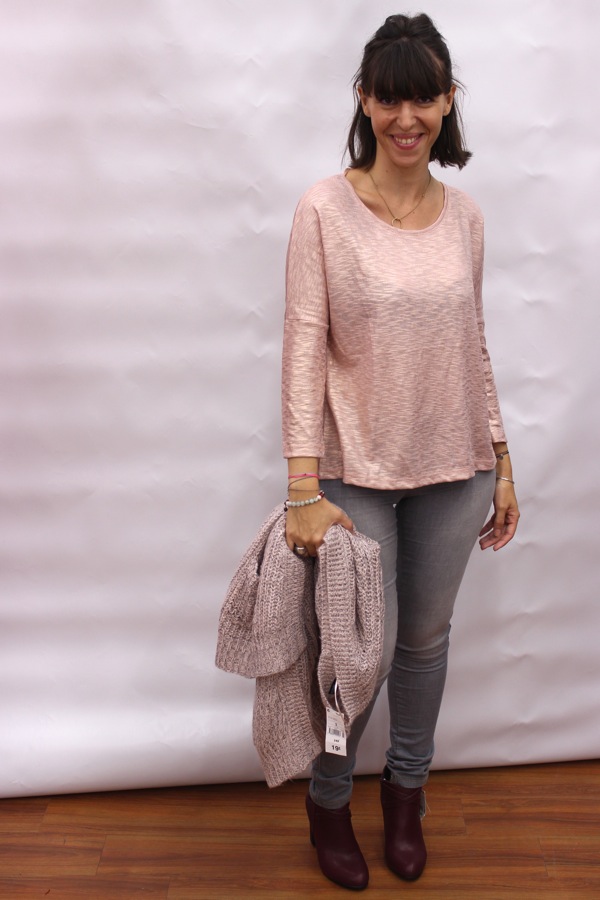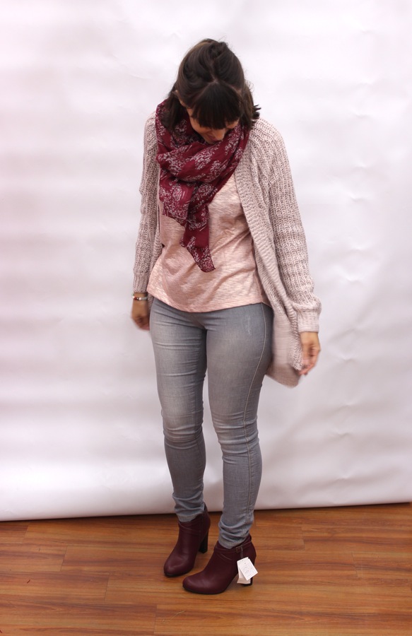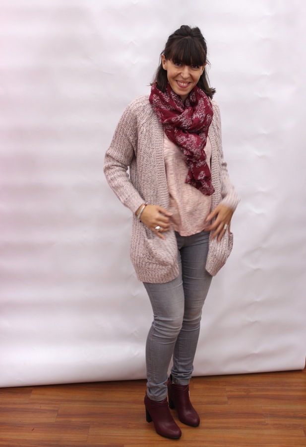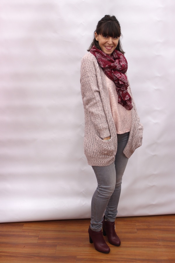 Le rose poudré et le gris se marient bien ensemble, le foulard et les chaussures plus foncées accentuent la tenue.