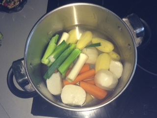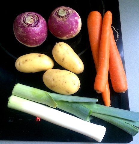 Pour réaliser cette soupe, il suffit en premier lieu d’éplucher les pommes de terre, les carottes et les navets puis les passer sous l’eau. Je garde le vert du poireau, mais seulement les feuilles tendres. Ensuite je coupe le tout en morceau.