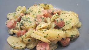 Vous aurez besoin de 5 grosses pommes de terre – 5 knakis – une échalote – du persil – quelques cornichons – vinaigrette ou mayonnaise.