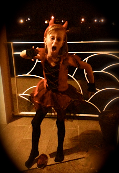 Comme vous le savez certainement, ce jeudi 31 octobre nous fêterons Halloween. Vous savez cette soirée où il se passe des tas de choses effrayantes.. dés la tombée de la nuit, des sorcières, des fantômes, des vampires et tout autres monstres se préparent afin de nous faire peur et de nous jeter un sort en tapant à nos portes. D’ailleurs en ouvrant ma porte, je retrouve une affreuse petite diablesse, complètement affamée, qui essaie son costume.