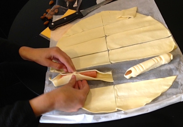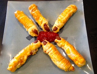 er les saucisses au 3/4. Découper des morceaux de pâte en rectangle. Disposer sur un rectangle de pâte un fromage couper en deux avec la saucisse puis enroulez pour former un boudin. Ajouter l’amande au bout pour former l’ongle, puis avec un couteau faire 3 entailles pour chaque articulations. Avant d’enfourner entre 7 et 10 min à 180°, il faut badigeonner les doigts avec le jaunes d’oeuf. Et voilà: