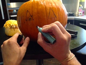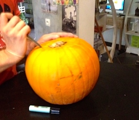 e la citrouille. 2 ème : Videz l’intérieur de la citrouille. 3 ème : Dessiner les yeux, le nez et la bouche. 4 ème : Couper à l’aide d’un couteau pointu vos contours de dessin. Ajouter la bougie à l’intérieur et mettez y votre touche personnelle. La mienne étant les cheveux noir …
