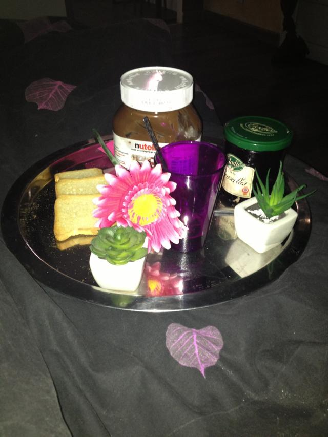 D’ailleurs ce matin pendant que je profitais de mon lit, j’entends soudain des petits pas dans le couloir et taper à la porte de ma chambre : La porte s’ouvre et je vois mon adorable petite puce avec un plateau presque plus lourd qu’elle, dans lequel elle m’a mis une tasse de café, des biscottes, de la confiture ainsi que de petites décos. C’était trop mignon….
